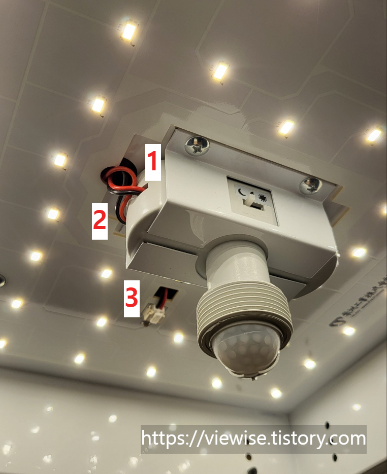 그리고 센서모듈에서 돌아 나오는 선과, 스위치에서 돌아나오는 선을 LED 조명 입력으로 보내면 됩니다.