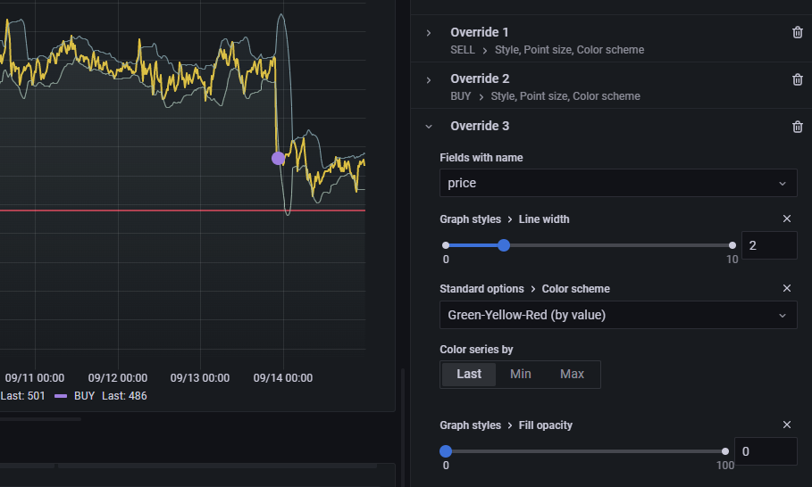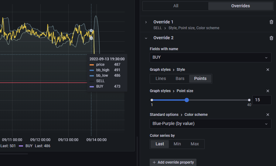 SELL 이라는 필드는 Graph style을 Points 로 하고, Point 사이즈를 15로 키웠습니다.