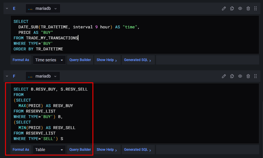 다른 필드는 모두 Time series 포멧인데 비해, 직선으로 표현된 매수 예정가격은 Table 포멧으로 설정하였습니다.